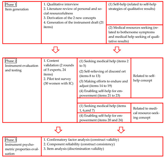 The ICSR combined personal and social resourcefulness concepts and followed the conceptual framework based on the first stage of qualitative results from women with IC [3] to derive the new concepts: self-help and medical resources. The flow chart of the development of the ICSR is shown in Figure 1.