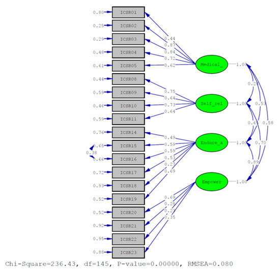 Four-factor model of the ICSR. Notes: Medical: seeking medical help; Self_rel: self-relieving of discomforts; Endure_a: making efforts to endure and adjust; Empower: enabling self-help for empowerment.