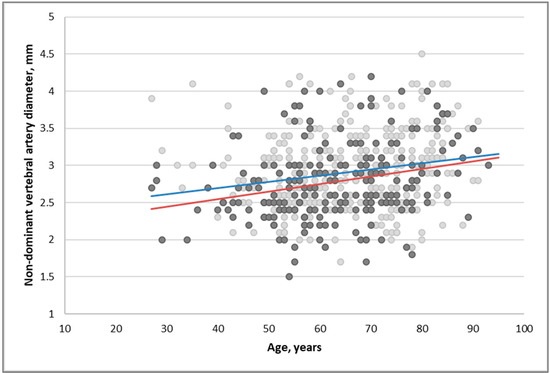 Association of non-dominant vertebral artery diameter and age in the group of patients with cerebral infarction or vertebrobasilar artery syndrome and subjects without symptoms of cerebrovascular accident. Red reference line represents patients with cerebral infarction or vertebrobasilar artery syndrome, blue reference line represents subjects without symptoms of cerebrovascular accident.