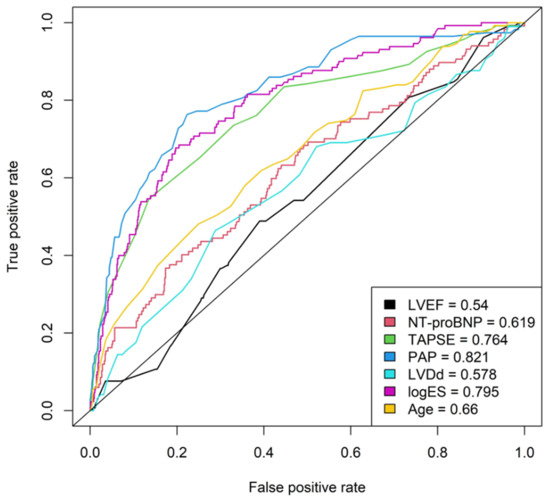 AUC: area under curve, EF: left ventricular ejection fraction, NT-proBNP: N-terminal prohormone of brain natriuretic peptide. TAPSE: tricuspid annular plane systolic excursion, PAP: pulmonary artery pressure, LVDd: diastolic diameter of left ventricle, logES: logistic EuroSCORE.