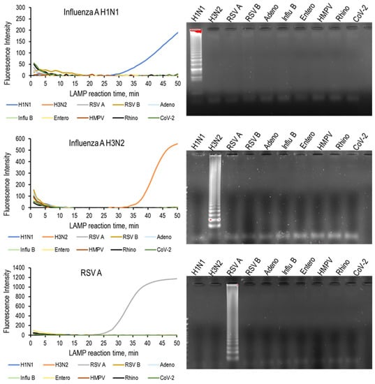 To assess assay target specificity, RNA/DNA from the 10 standard strains was tested, and an amplification was observed only for the respective standard strains. In addition, for the samples with no amplification, no amplicons were observed by gel electrophoresis (Figure 1). The RT-qLAMP assays developed for RSV A, RSV B, ADV, Flu A (H1N1 and H3N2), Flu B, and SARS-CoV-2 had acceptable specificity against other common respiratory viruses.