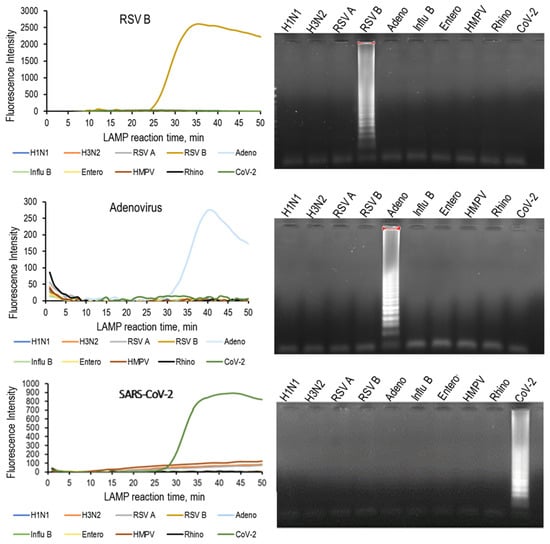 (Left) RT-qLAMP results and (right) agarose gel electrophoresis of RT-qLAMP products for the corresponding virus with RNA/DNA from standard strains of 10 respiratory viruses. Amplification was observed only for the respective standard strains and no cross-reactivity was observed. RSV: respiratory syncytial virus, HMPV: human metapneumovirus, CoV-2: severe acute respiratory syndrome coronavirus 2.