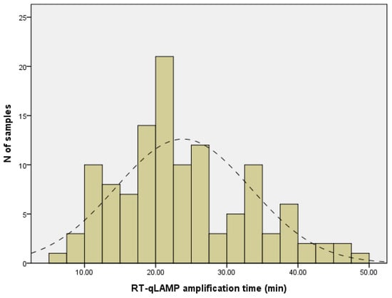 The frequency of amplification time to positivity for RT-qLAMP. The lines of dashes indicate the normal fitted distribution. The mean amplification time to positive results was 22:45 min and all positive test results were obtained within 48 min.