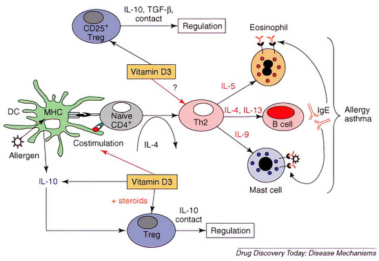 Vitamin D3 regulates various stages of allergic responses and promotes dendritic cells (DCs) to produce IL-10 to support Treg development. Moreover, vitamin D3 acts synchronously with steroids to induce IL-10-peripheral Treg, which can regulate the next process of the immune response by inhibiting the proliferation and differentiation of Th2 effectors through IL-10 production. Vitamin D3 has the potential to regulate Th2 immune responses by inducing CD4+CD25+ Tregs to produce regulatory cytokines, such as IL-10 or TGF-β. The direct effect of vitamin D3 with Th2 effectors is still controversial, as shown in Figure 1 [36].