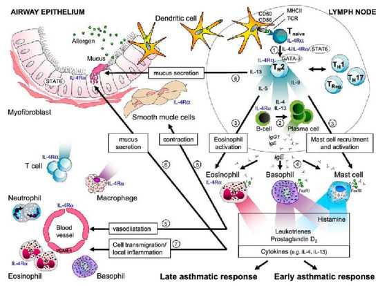 IL-4 is produced by Th2 cells, mast cells, basophils, eosinophils, and the alveolar macrophages [39]. IL-4 is a pleiotropic cytokine that binds to the IL-4 receptor expressed by T lymphocytes, B lymphocytes, mononuclear phagocytes, eosinophils, pulmonary fibroblasts, endothelial cells, bronchial epithelial cells, and smooth muscle cells. IL-4 is involved in the different mechanisms leading to allergic airway disease. Transcription factors are activated by the IL-4/IL-13 signaling cascade (Figure 2) [39].