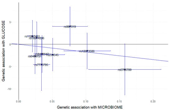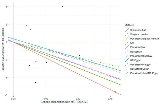 Above, we analyzed the Mi-RSNPs separately. However, the microbiota can exert its effects jointly, such that it is a combination of taxa that enhances the favorable or detrimental effects on the studied outcome. Due to the fact that the previously selected Mi-RSNPs (Table S1) came from several studies carried out in different populations [,,,] and with different methodologies, to perform the Mendelian randomization analysis, we preferred to consider only a single mbGWAS carried out uniformly in a European population, the FINRISK study []. From this European population (n = 5959), we selected genetic instruments as detailed in Section 2 and obtained the instrument–exposure associations. Then, we performed a two-sample Mendelian randomization study [] using our Mediterranean population as the second population (n = 1020) to test the instrument–outcome associations. We preselected the first (n = 12) top-ranked Mi-RSNPs from the FINRISK study on fasting glucose in our population and tested if these Mi-RSNPs were a good instrument according to Mendelian randomization core assumptions [,]. The p-value for the associations between each of them with the exposure (microbial trait) was very significant (ranging from 4 × 10−8 to 8 × 10−9), and the F statistics were >10. In addition, genetic variants would be excluded if the MAF was less than 0.1. We detected and excluded two SNPs with MAF <0.10. Therefore, the first assumption, relating to the strength of the association with the exposure, was confirmed. The second Mendelian randomization assumption was related with pleiotropy, and we excluded the MCM6 SNP, as previously reported []. Later, the MR-Egger regression slope was tested to confirm the absence of pleiotropy. Thus, nine Mi-RSNPs were preselected as good instrumental variables for the Mendelian randomization study with multiple instruments. Table S5 shows the nine preselected instruments, the related microbial trait and the coefficients for the two populations after the required harmonization, as detailed in Section 2. Different Mendelian randomization methods were used to estimate the so-called “causal” effect, as detailed in Section 2. Figure 1 shows the scatter plot of genetic associations with gut microbiome against the genetic association with outcome (fasting plasma glucose) for the nine preselected instruments (indicated SNPs).