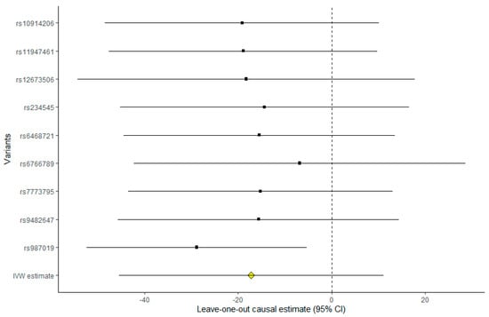 Leave-one-out sensitivity analysis for the association using the nine SNPs. Each point and error line represents the MR analysis (using IVW) excluding that particular SNP. The overall analysis including all SNPs is also shown for comparison. SNPs: Single nucleotide polymorphisms.