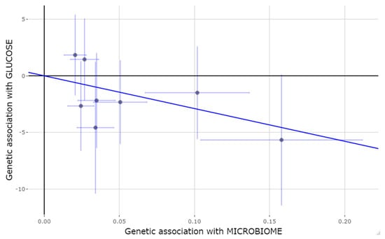 Figure 2 shows the scatter plot and the regression lines of genetic associations with gut microbiome against genetic associations with fasting glucose.