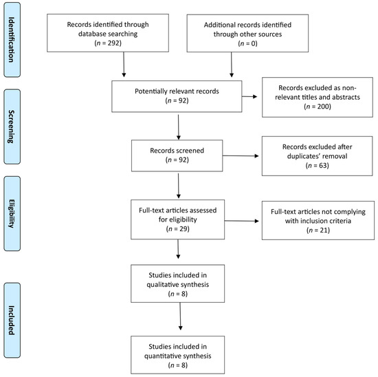 According to the final literature search, which was performed on 3 June 2022, 292 potentially interesting studies were found (PubMed/MEDLINE: 53 records; Scopus: 148 records; Cochrane Library: 25 records; Web of Science: 66 records) (Figure 1). Although analysis covered all 292 studies, 200 ones turned out as not relevant for title and abstract, while 92 full-texts were considered eligible. Then, 63 out of 92 studies were ruled out as duplicate publications. Following the exclusion of 21 studies not complying with inclusion criteria, 8 comparative studies (seven retrospective studies and one randomized controlled study) underwent qualitative and quantitative synthesis [16,17,18,19,20,21,27,30]. No additional record was found through other sources (References list). Six out of the seven retrospective studies used propensity score matching (PSM) analysis [16,17,19,20,21,30].