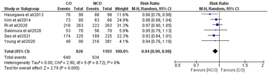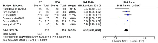 Overall, six studies out of the eight included ones [16,17,18,19,20,21] comprising 1929 patients (CO 826, NCO 1103) who reported both 3-year and 5-year Oss (Figure 2 and Figure 3). The meta-analysis of pooled results showed that 3-year OS (RR: 0.94, 95% CI: 0.90–0.98, p = 0.005) and 5-year OS (RR: 0.93, 95% CI: 0.88–0.98, p = 0.007) in the NCO group were statistically significantly higher than in CO group. For both outcomes, the detected heterogeneity was low but statistically negligible (3-year OS–I2 = 0%, p = 0.72; 5-year OS–I2 = 5%, p = 0.38).