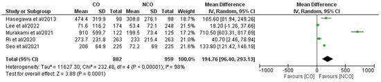 In total, five of the eight included studies [16,19,21,27,30] comprising 1841 patients (CO 882, NCO 959) reported estimated blood loss (Figure 5). Meta-analysis of the pooled results showed a statistically significant higher estimated blood loss for the CO group, when compared to the NCO group (MD: 194.76, 95% CI: 96.40–293.13, p = 0.0001). Heterogeneity was high and statistically significant (I2 = 98%, p < 0.00001).