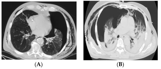 - Chopra, A.; Al-Tarbsheh, A.H.; Shah, N.J.; Yaqoob, H.; Hu, K.; Feustel, P.; Ortiz-Pacheco, R.; Patel, K.M.; Oweis, J.; Kozlova, N.; et al. Pneumothorax in critically ill patients with COVID-19 infection: Incidence, clinical characteristics and outcomes in a case control multicenter study. Respir. Med. 2021, 184, 106464. [Google Scholar] [CrossRef]