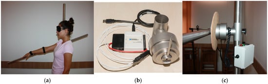 Presentation of the Kinesimeter device: (a) the Kinesimeter axis, fixed and mobile arm position for shoulder JPS rehabilitation in flexion; (b) measurement and data transfer mechanism for real-time oscillograms; (c) sound generator used for auditory feedback.