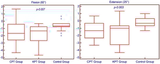 In both CPT and KPT groups, the post-intervention absolute errors were lower than the baseline absolute errors for all studied movements (flexion, extension, internal rotation, external rotation and abduction) and the JPS was statistically significantly improved: all p < 0.001. In the control group, the post-intervention absolute errors were not lower than the baseline assessment absolute errors for extension (p = 0.275), internal (p = 0.122) and external (p = 0.203) rotations, but statistically significant lower, thus improved, for flexion (p = 0.047) and abduction (p = 0.027), Table 3.