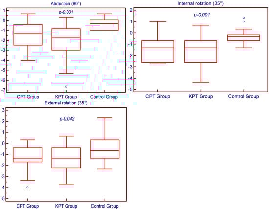 Both KPT and CPT groups showed statistically significant improvements in JPS after four weeks of rehabilitation, compared to the control group which received no proprioceptive training (all p < 0.05). The comparative analysis with the control group finds the most considerable differences and thus the most significant improvements during flexion (p = 0.001), abduction (p < 0.001) and internal rotation (p < 0.001) movements for the KPT group, and during flexion (p = 0.001) and internal rotation (p = 0.001) movements for the CPT group. However, the recorded results reveal that there are no statistically significant differences in JPS improvements between the group that underwent a classical proprioceptive training program and the group that underwent an innovative proprioceptive training program, for all the studied categories (flexion p = 0.406; extension p = 0.57; abduction p = 0.173; internal rotation p = 0.537 and external rotation p = 0.688). The JPS inter-group comparative analysis is summarized in Figure 2.