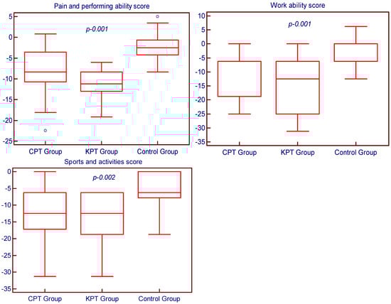 In all three groups the post-intervention results were lower than the baseline assessment results and the scores for pain and performing ability, work ability, sports and activities ability were statistically significantly improved: all p < 0.05, Table 4.