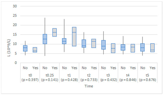 Box plots of leukocyte count in EDTA blood at each time point by anastomotic leakage (No/Yes).