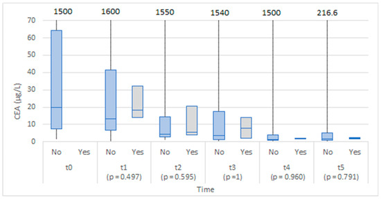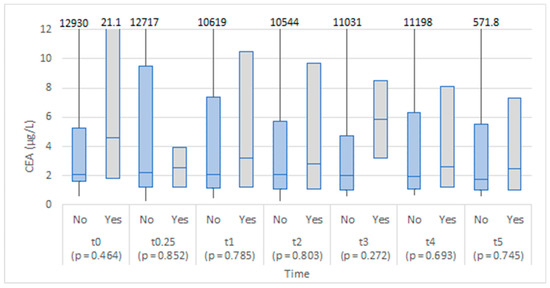 Box plots of CEA in serum at each time point by anastomotic leakage (No/Yes).