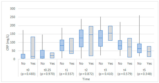 Box plots of CRP in serum at each time point by anastomotic leakage (No/Yes).