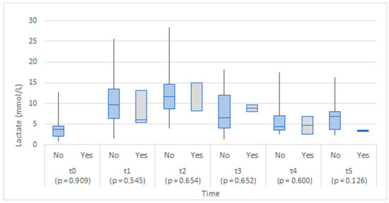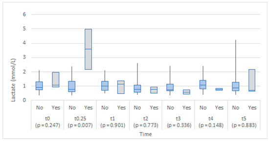 Box plots of lactate in serum at each time point by anastomotic leakage (No/Yes).
