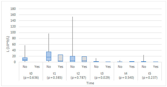 The values of each biomarker by anastomotic leakage at each time point are illustrated in Figure 1, Figure 2, Figure 3, Figure 4 and Figure 5. At each time point, the differences were tested by the Mann–Whitney U test. No statistically significant differences in leukocyte count between the study groups were found at any time point, although there appeared to be a steeper increase in leukocyte count in the anastomotic leakage group one day (t1) after the operation (Figure 1).