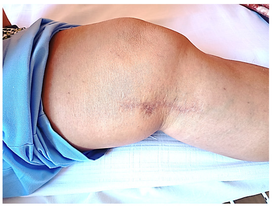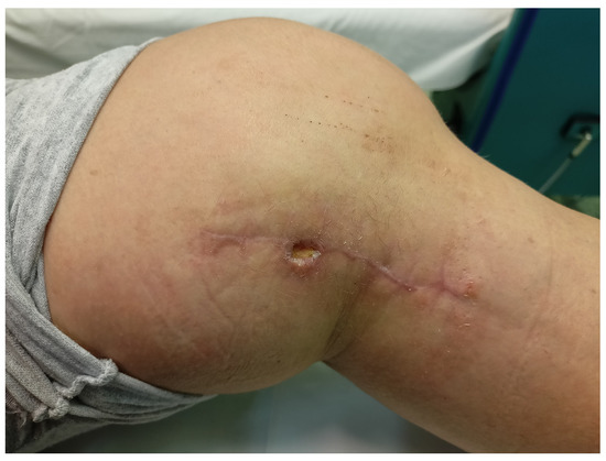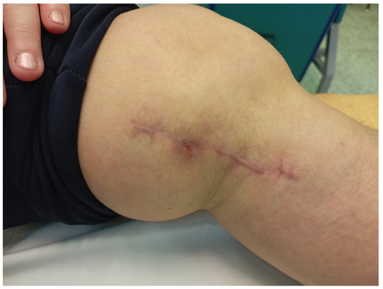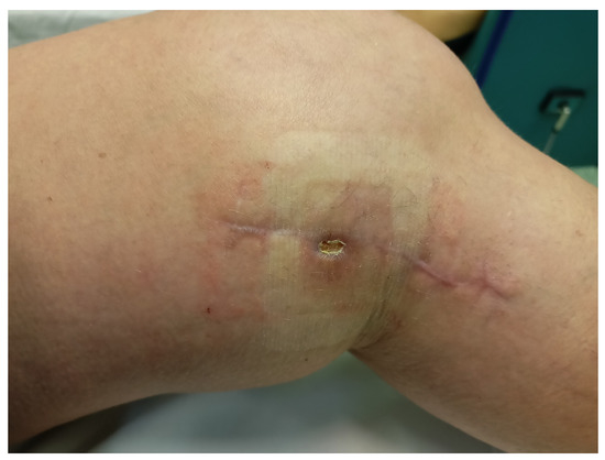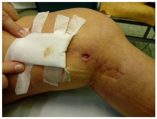 A 61-year-old female patient came to the Department of Internal Medicine, Angiology and Physical Medicine of Specialistic Hospital no. 2 in Bytom due to a dehiscence of a left knee surgical wound after a traffic accident (the patient was hit by a car at a pedestrian crossing). Immediately after the accident, the patient, as an emergency case, was taken to the orthopaedics ward of the Hospital Emergency Unit. The physical examination and imaging examinations (X-ray and MRI of the knee joint) performed in the orthopaedics ward revealed dislocation, sprain, and tear of the anterior cruciate ligament, as well as damage to the medial meniscus of the left knee joint of the 3rd degree (according to O’Donoghue triad), that was confirmed in intra-surgery observation. On the day of admission to the orthopaedic ward, the patient underwent an open surgical procedure consisting of suturing the ligaments with Ti Screw ES 5.0 BIOMET anchors and suturing the medial meniscus. The course of the surgical procedure and post-operative period were without complications. After surgical procedure, moving about with the use of crutches and not leading of the operated lower extremity were prescribed. The patient was supplied with a knee functional orthesis (0–15° in extension) and performed active and isometric exercises of the operated lower extremity. The patient was discharged with the recommendation of continuing the above rehabilitation and continued medication, consisting of: Clexane 0.4 mL 1 × 1 ampoule s.c., Cyclo 3 fort 2 × 1 tablet and Poltram Combo in tablets in case of pain intensification. After 14 days, the postoperative sutures were removed in Orthopaedic Consulting Unit, and after a further few days, the separation of wound lips occurred. The patient returned to the orthopaedic department, where the consulting orthopaedic physician proposed a revision procedure due to the separated wound, but the patient did not give consent to this form of treatment without any specific reason.