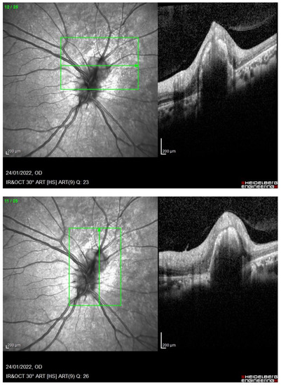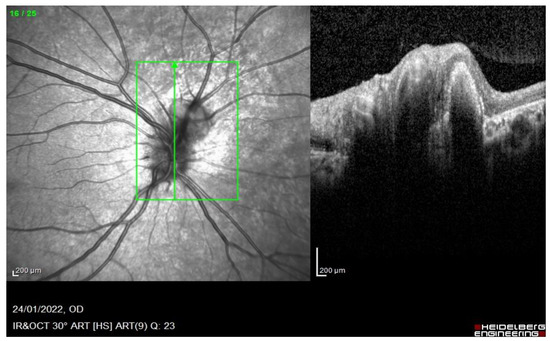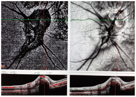 Tubulointerstitial nephritis and uveitis syndrome (TINU) is a multi-organ disorder characterized by an association between acute renal injury and ocular inflammation. TINU was reported in the ophthalmological literature for the first time in 1988 by Rosenbaum et al. [1], 13 years after its original description [2] from which the “Dobrin syndrome” name comes. It represents 0.2–2% of the uveitis diagnosis [3,4,5] and approximately 5% of nephritis cases [6]. It is likely underdiagnosed because of a lack of associated signs and symptoms which consequently do not usually lead to targeted investigations [7]. TINU may be related to autoimmune systemic diseases, infections, and previous use of drugs [8]. Although there are reported cases in elderly patients, it typically affects children and young adults, and occurs in females three times more often than in males [5,9]. Clinical features could be non-specific (fever, abdominal pain, loss of weight, tiredness, malaise, anorexia, and headache) and renal involvement [5] could lead to different stages of kidney failure [7]. Uveitis can appear up to more than one year after the episode of nephritis, such as the majority of cases (65%), but can also precede it or be concomitant [8]. Typical ocular involvement is characterized by bilateral anterior uveitis [8], although cases of intermediate and posterior uveitis and panuveitis are not uncommon. Chorioretinal lesions with neovascular membrane are also rarely reported, mainly in adult patients [10]. We describe the case of a TINU diagnosed in childhood, in which the uveitis began as anterior and bilateral at the onset, and was complicated by bilateral papillitis and unilateral juxtapapillary choroidal neovascularization (CNV).