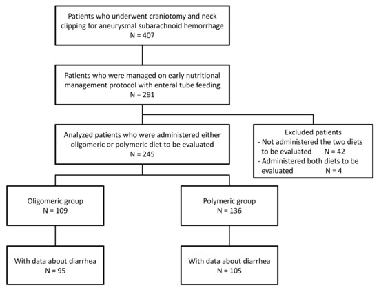Background and Objectives: Nutritional management in patients with subarachnoid hemorrhage (SAH) during the acute phase is important; however, there is no proper evidence or recommendations on the appropriate nutrients for early enteral nutrition. This study compared the influence the two different tube-feeding liquid diets for early enteral nutrition might have on the prognosis of patients with SAH. Materials and Methods: In a seven-year period, this single-center retrospective study included 245 patients with aneurysmal SAH who underwent craniotomy and aneurysm neck clipping and received enteral nutrition. The patients were divided into two groups according to the nutrient received: (1) high-protein whey peptide oligomeric formula diet (oligomeric group, 109 patients); and (2) high eicosapentaenoic acid-containing polymeric formula diet (polymeric group, 136 patients). The modified Rankin Scale (mRS) score at discharge was evaluated as the primary outcome. The presence or absence of diarrhea (watery stool and mushy stool) during the period from initiation of enteral nutrition to discharge from the stroke unit was also evaluated. Results: There were no significant differences in patient characteristics between groups. The time until initiation of enteral feeding in the oligomeric and polymeric groups was 2.8 ± 2.3 and 2.9 ± 2.2 days, respectively. The proportion of patients with mRS scores of 0–1 was significantly higher in the oligomeric group (25.7%) than in the polymeric group (14.7%) (p = 0.036), while the incidence of watery stool was significantly lower in the oligomeric group (15.8% to 34.3% in the polymeric group) (p = 0.003). Multivariate analyses confirmed that the oligomeric diet and the presence or absence of diarrhea significantly affected the mRS scores. Conclusions: The adoption of early enteral nutrition with high-protein whey peptide digestive nutrients might be associated with superior mRS scores at discharge and decreased diarrhea in patients with SA, indicating that the choice of nutrients might affect the outcome and prognosis.