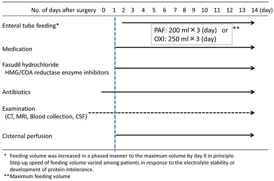 A craniotomy for the aneurysm neck clipping is an advanced, and sometimes high-risk procedure [3]; and nutritional requirements are higher than that in normal circumstances or after coiling [4]. In SAH patients, the daily demand for proteins increases significantly in the acute phase due to increased anabolism and catabolism, and stress coefficients for the necessary calories’ calculation are anticipated to be high [5,6]. Malnutrition during the post-stroke acute phase is an independent factor for poor outcome [7], and a multicenter study found that SAH patients received under 60% of their prescribed caloric and protein intake [8]. According to a report in Japan, 44% patients with cerebral infarction and 100% patients with SAH who were transferred from acute-phase hospitals to recovery-phase hospitals reportedly had a nutritional disorder, and even a specific score was recently introduced to assess the correlation between nutrition and outcomes [9,10].