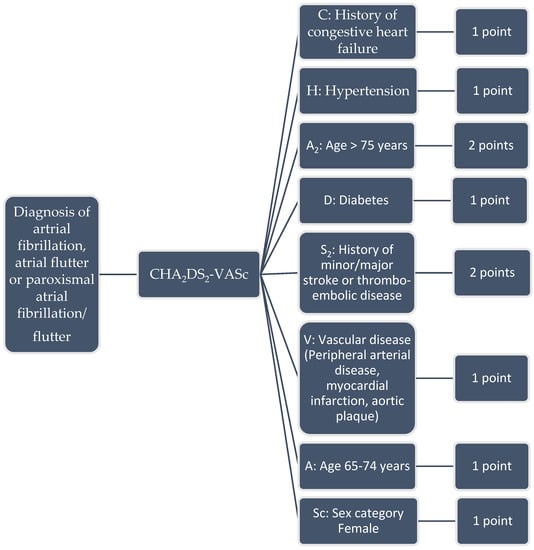 - Van Doorn, S.; Rutten, F.; O’Flynn, C.; Oudega, R.; Hoes, A.; Moons, K.; Geersing, G. Effectiveness of CHA2DS2-VASc based decision support on stroke prevention in atrial fibrillation: A cluster randomised trial in general practice. Int. J. Cardiol. 2018, 273, 123–129. [Google Scholar] [CrossRef] [PubMed]