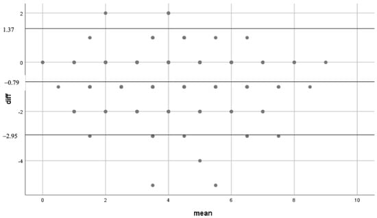 Bland-Altman analysis indicated a bias of −0.79 with limit of agreement (95%-CI) between −2.95 and 1.37 between the two interventions. Linear regression analysis indicated no significant relation (R = 0.477 (95%-CI: 0.435–0.519), p > 0.05) (Figure 3).