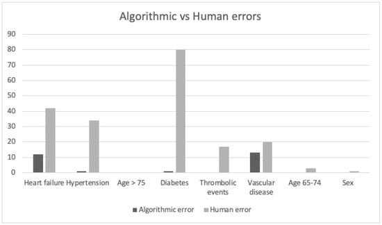 Algorithmic vs. Human errors. Algorithmic error: items aCDSS missed. Human error: items physicians missed (mCDSS). Heart failure: 12 algorithmic errors, 42 human errors. Hypertension: 1 algorithmic error, 34 human errors. Diabetes: 1 algorithmic error, 80 human errors. Thrombo-embolic events: 0 algorithmic errors, 17 human errors. Vascular disease: 13 algorithmic errors, 20 human errors. Age 65–74: 0 algorithmic errors, 3 human errors. Sex: 0 algorithmic errors, 1 human error. From in total 224 errors, were 88% human.