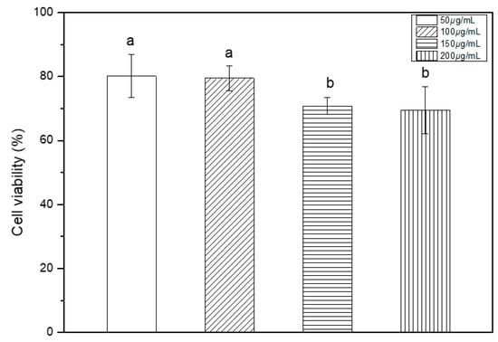 Paeonia lactiflora extract of cell viability (contents of 50 μg/mL, 100 μg/mL, 150 μg/mL, and 200 μg/mL.). ab The difference letter indicates statistics significant difference by One-Way ANOVA (p < 0.05).