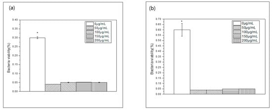 Result of bacteria viability test contents of 50 μg/mL, 100 μg/mL, 150 μg/mL, and 200 μg/mL (a) S. mutans group (b) C. albicans group. * The indicates statistics significant difference by One-Way ANOVA (p < 0.05).