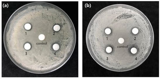 Inhibition zone test result (a) S. mutans group (1: 50 μg/mL, 2: 100 μg/mL, 3: 150 μg/mL, 4: 200 μg/mL) (b) C. albicans group (1: 50 μg/mL, 2: 100 μg/mL, 3: 150 μg/mL, 4: 200 μg/mL).