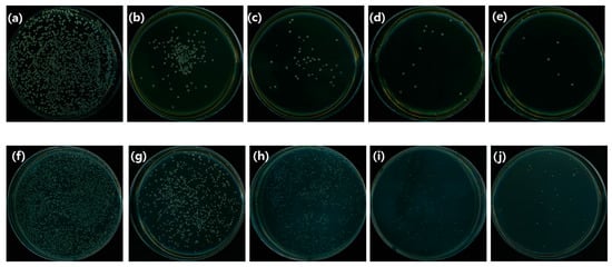 CFU results for S. mutans group (a) 0 μg/mL (b) 50 μg/mL (c) 100 μg/mL (d) 150 μg/mL (e) 200 μg/mL); C. albicans group (f) 0 μg/mL (g) 50 μg/mL (h) 100 μg/mL (i) 150 μg/mL (j) 200 μg/mL).