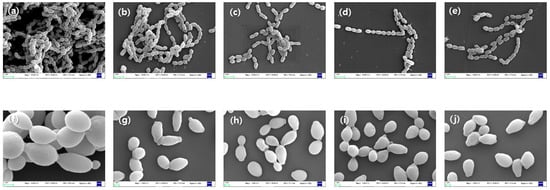 Result for bacterial morphology effect of S. mutans control group × 1000 (a) 0 μg/mL (b) 50 μg/mL (c) 100 μg/mL (d) 150 μg/mL (e) 200 μg/mL and C. albicans group: (f) 0 μg/mL (g) 50 μg/mL (h) 100 μg/mL (i) 150 μg/mL (j) 200 μg/mL.