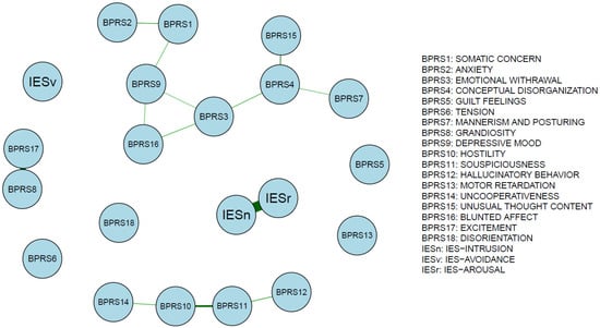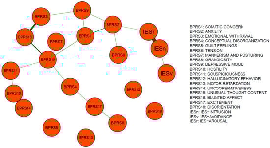 A network analysis [] was implemented in order to assess the association of BPRS items with IES-R subscales. The network was estimated according to a Graphical Gaussian Model (GGM), where the edges (the connections between the symptoms) represent conditional dependence relationships among the nodes (representing symptoms). The magnitude of the association is shown by the thickness of the edges. In other words, each edge connecting two nodes represents the unique shared covariance between two variables, after adjusting for all other nodes in the network. The R-package qgraph was employed to visualize the network structure. The Graphical Least Absolute Shrinkage and Selection Operator (GLASSO) procedure was used to highlight the strongest sets of connections and to obtain a sparse network [,].