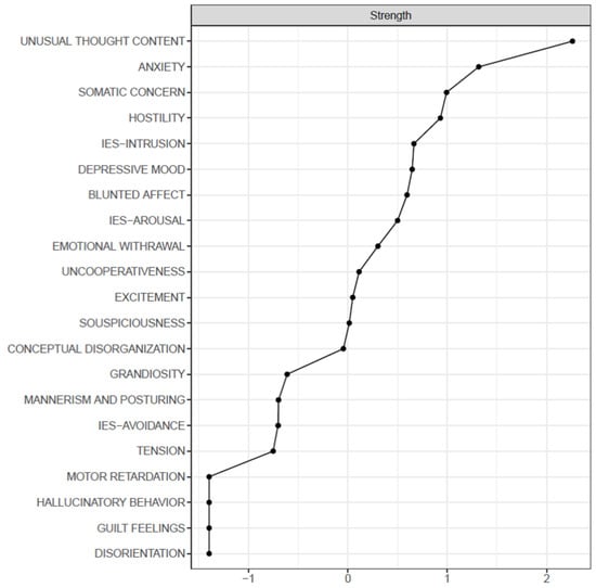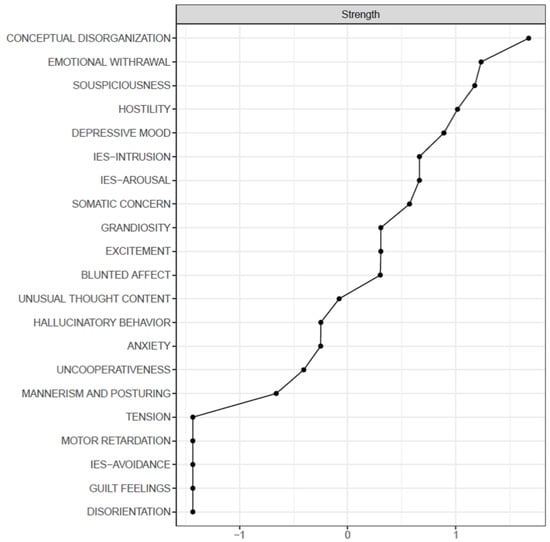 Regarding our network analysis, the results show that Unusual Thought Content, Anxiety, and Somatic Concern represented the most central symptoms in April, while in November, Conceptual Disorganization, Emotional Withdrawal, and Suspiciousness were prevalent.