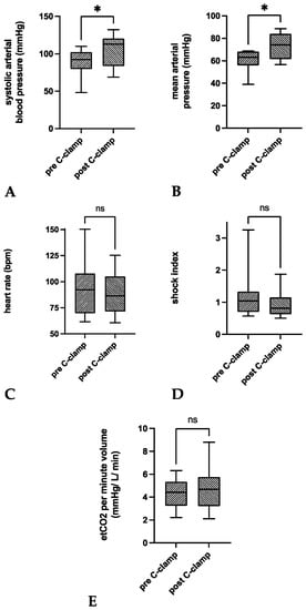 Box plots of the pairwise comparisons of means 30 min before (pre C-clamp) and after (after C-clamp) C-clamp application for (A) sABP, (B) MAP, (C) heart rate, (D) shock index, and (E) etCO2 per minute volume. Paired comparisons of respective means revealed a significant mean increase of sABP (+14.9 mmHg; 95% CI 1.9–28; p = 0.0284) and MAP (+12.1 mmHg; 95% CI 2.1–23.5; p = 0.0157) after C-clamp application. Mean HR, SI, and etCO2 per minute volume did not significantly differ before and after C-clamp application. Box—interquartile range; bar—median. * p < 0.05.