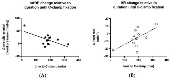 Relation of the magnitude of the effect on (A) sABP and (B) HR and time passed until C-clamp application. The earlier C-clamp application was performed, the greater the effect regarding sABP elevation. The earlier C-clamp application was performed, the greater the effect of HR reduction.
