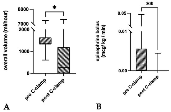 Box plots of the pairwise comparisons of medians before and after C-clamp application for the (A) overall volume administered per hour and the (B) epinephrine bolus. Both the volume substitution and epinephrine bolus administration significantly decreased within the first hour after C-clamp application (p < 0.05). Box—interquartile range; bar—median. * p < 0.05; ** p < 0.01.