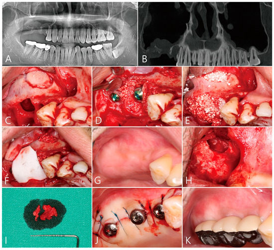 Case 1. (A) Preoperative panoramic radiography. A severe defect is present in the maxillary right posterior extraction socket, and the height of the residual bone is low; (B) panoramic image of CBCT taken preoperatively. A compromised extraction socket is observed in the right maxillary sinus, and the maxillary sinus membrane is thickened; (C) after the flap was reflected, the granulation tissue in the extraction socket was thoroughly removed. The buccal bone defect was severe. A lateral bone window was prepared for sinus floor elevation; (D) the maxillary sinus bone graft using synthetic bone graft substitute was performed and two implants were installed; (E) the peri-implant defect was additionally filled with a bone graft substitute; (F) resorbable collagen membrane was used to cover the grafting material and the flap was closed; (G) clinical findings 6 months after surgery. Healing was uneventful; (H) After the flap was reflected, the graft void was removed; (I) the removed specimen which was not clearly separated from the surrounding tissue; (J) after insertion of the healing abutment, the flap was closed; (K) Clinical appearance after delivery of the prosthesis.