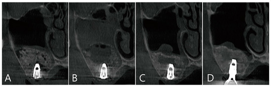 The coronal images of CBCT taken during the healing process after surgery were examined. There was no leakage of bone graft particles in the CBCT taken immediately after surgery (Figure 7A). One week after surgery, a large grafting void was developed over the apical third of the implant, and thickening of the sinus membrane was observed (Figure 7B). The shape of the grafting void after 6 months of surgery became clear and the size decreased. The sinus membrane thickening was also reduced. The void was filled with homogenous contents and showed a cystic appearance (Figure 7C). In the CBCT taken 6 months after the prosthesis was delivered, the bone graft substitute filled the grafting void well (Figure 7D).