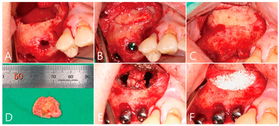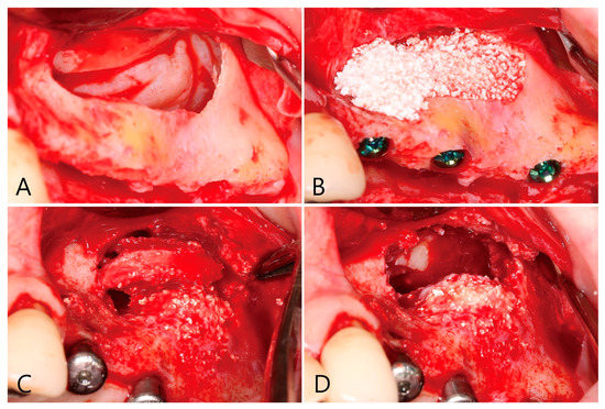(A) The ovular lateral window was formed using a surgical round bur on the buccal bone. The Schneiderian membrane was detached from the sinus floor and elevated. No perforation of the Schneiderian membrane occurred; (B) biphasic calcium phosphate was mixed with physiological saline and placed in the maxillary sinus. Three implants were simultaneously placed; (C) six months after the MSA, when the buccal flap was reflected, the buccal bone which was interconnected with the void was removed. Healing abutments were inserted into the implants; (D) gentle debridement and saline irrigation were performed on the removed voided site. The removed site was not refilled with a bone graft substitute.