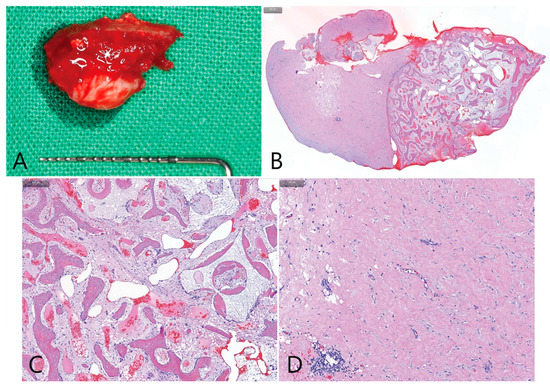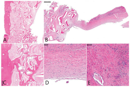 (A) The removed specimen was fixed in 10% formalin solution for histopathological examination; (B) the specimen was examined after hematoxylin and eosin (H&E) staining. Newly formed bone and void tissue were clearly bordered; (C) new bone formation was found around the bone graft particles, and osteoblasts, osteocytes, and osteoclasts were observed; (D) no new bone formation was observed in the void area. Epithelial cells containing cilia were not observed in the void tissue which consisted only of dense connective tissue.