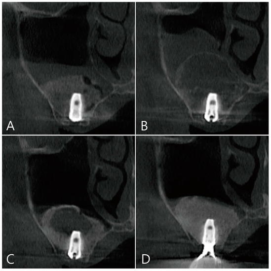 Coronal images of the CBCT were taken at multiple points during the healing process after surgery: (A) an image taken immediately after surgery; (B) an image taken one week after surgery. A large grafting void occurred over the apical half of the implant, and thickening of the maxillary sinus mucosa was also observed; (C) in the image 6 months after surgery, the size of the grafting void was slightly reduced. The void presents with a cystic appearance resembling SCC. The apical bony support of the implant was lost. The grafting void was removed and additional bone grafting was performed; (D) in the CBCT image taken 6 months after the prosthesis was delivered, it can be confirmed that the previous grafting void was replaced with a bone graft substitute.