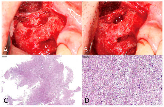 Implant placement was performed 6 months after surgery. After removing the lateral window repositioned during lateral window technique, the grafting void in the bone graft was removed using a periodontal curettes. The specimen was very fibrotic and difficult to separate from the surrounding bony tissues (Figure 9A). The grafting void was connected to the previous tooth extraction socket. It was large enough to affect implant placement (Figure 9B). Histologically, the specimen showed a very irregular appearance, and inflammatory cells and ciliated columnar epithelium were not observed. The grafting viod was entirely filled with dense connective tissue (Figure 9C,D).