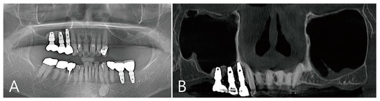 Case 2. (A) On preoperative panoramic radiography, severely atrophied residual ridges were observed in the missing area of the left and right maxillary molars, and the maxillary sinuses were pneumatized; (B) a panoramic image of the preoperative CBCT showed slight thickening of the sinus membrane on the sinus floor.