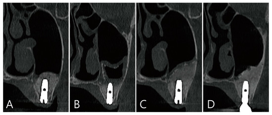 (A) Coronal image of the CBCT taken immediately after surgery. There was no perforation of the maxillary sinus membrane and no leakage of the bone graft substitute; (B) coronal image of the CBCT taken one week after surgery. A severely enlarged grafting void was observed above the implant apex, and the ostium was obstructed due to severe membrane thickening; (C) coronal image of the CBCT taken 6 months after surgery. Although the grafting void was reduced in size, it appears similar to the SCC; (D) the radiopacity of the removed grafting void site was increased in the CBCT images taken 6 months after the prosthesis was delivered.